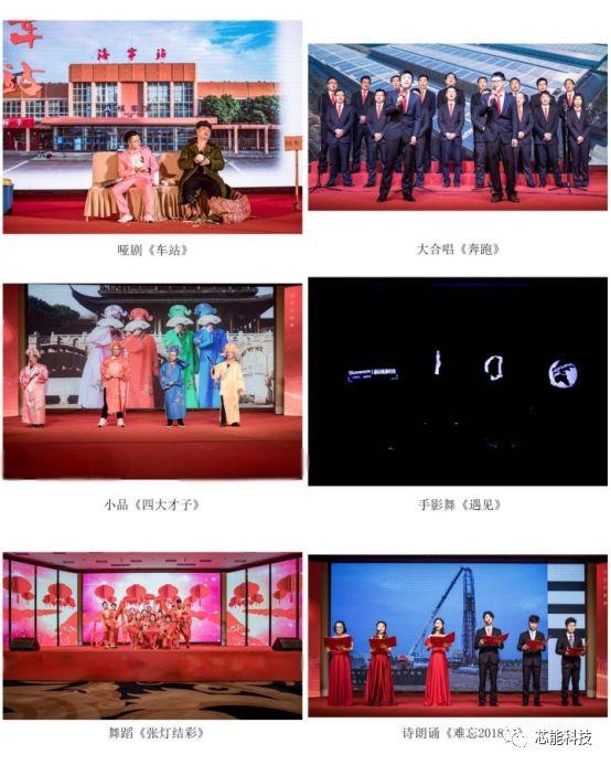 年会上还呈现了一台由芯能人自行表演的丰富多彩的歌舞表演。喜庆欢乐的舞蹈《张灯结彩》拉开了歌舞表演的序幕,点燃了现场的热情。有巧妙的将电站事业部日常工作融入到小品之中的《江南四大才子》,表演诙谐、有张力;原创作品诗朗诵《难忘2018》书写2018年公司经历的点点滴滴;别具一格的手影舞《遇见》;仅仅依靠肢体语言和面部表情便能惟妙惟肖展现一个小故事的哑剧《车站》;此外还有歌喉美妙的个人独唱等,无不彰显着芯能人的活力和文艺才能。期间穿插的微信红包大放送,更是频频将年会气氛推向高潮。